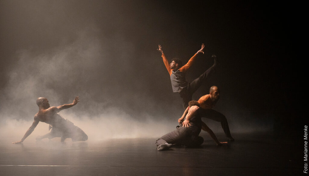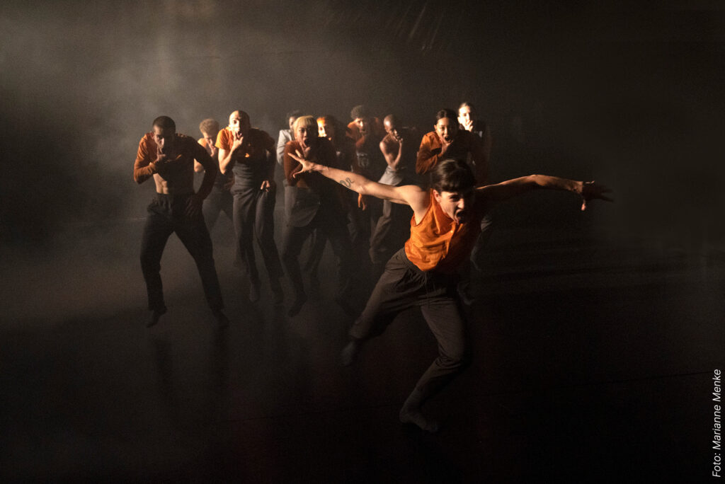 UN-ZEIT entwirft in einen Nebelraum hinein hypnotische Bilder. Die Wahrnehmung der Zeit scheint sich zu zerfasern, die eben noch geordneten Bewegungen der Gruppe verlieren ihre Geradlinigkeit. Einzelne fallen aus der Form heraus und bewegen sich radikal, orientierungslos. Haltungen winden sich unter dem Eindruck neuer Realitäten und Widersinnigkeiten. Bewegungen geraten aus der Form und Körper tasten in intimen Momenten suchend nach Verlässlichkeit und Halt.
